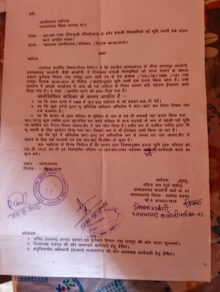 धर्मजयगढ़ -: रायगढ़ जिले के धर्मजयगढ़ तहसील में भारत सरकार द्वारा भारत व बंगलादेश विभाजन के समय 642 वो परिवार को r.r.no ( रिफ्यूजी रजिस्ट्रेशन नंबर) प्रदान करते हुए 7 एकड़ व 5 एकड़ भूमि प्रदान करते हुए धर्मजयगढ़ कॉलोनी बायसी कॉलोनी व सागरपुर कॉलोनी दर्शाया गया /इन विस्थापितों को राज्य शासन केके आपदा प्रबंधन रायपुर पुर्नावास विभाग नया रायपुर द्वारा जारी पत्र क्रमांक/123/28/2006/181 दिनांक 30/04/2014 के निर्देश/ आदेशानुसार _भूमि स्वामी हक प्रदान करने जारी किया था। तहसीलदार धर्मजयगढ़ के द्वारा उक्त आदेशानुसार 2016_17 में विस्थापितों को आवश्यमक कर्णकट उपलब्ध कराने के पश्चात भूमि स्वामी हक दिया गया। जिनमें से लगभग 15_20 गैर विस्थापित परिवारों के द्वारा पटवारियों से सांठ गांठ कर बनवा लिया है। न्यायालय तहसीलदार द्वारा इन विस्थापितों को पट्टा देने से पूर्व जारी दावा आपत्ति मंगवाया गया था। निर्धारित समयावधि में समाज के जागरूक पूर्व पार्षद व अन्य के द्वारा न्यायालय तहसीलदार/ इस्थार /9/8/2016 के परिपड्य में दिनांक 24/8/2016 को आपत्ति करते हुए आवेदन देते हुए सचिव (राजस्व) आपदा प्रबंधन एवं पुर्नावास विभाग नया रायपुर जिलाध्यक्ष रायगढ़ एवं अनुविभागीय अधिकारी (राजस्व) धर्मजयगढ़ आवश्यक कार्यवाही हेतु प्रेषित करते हुए पट्टा प्राप्त करने वाले विस्थापित को r.r.no की जांच करते हुए पट्टा देने की मांग की थी। आपत्ति आवेदकों द्वारा अपने आपत्ति में उल्लेखित करते हुए लिखा कि शासन द्वारा परिवार के मुखिया के नाम से एक ही अस्थाई पट्टा प्रदान किया गया था। परंतु कुछ लोगों द्वारा कुटरथित कर अपने परिवार के अन्य सदस्यों के नाम रिक्त पड़े भूमि पर कब्जा करते हुए नियम विरुद्ध खसरा बी _1 में नाम जोड़ लिया। जो भूमि स्वामी पाने आवेदन प्रस्तुत किया गया जिस कारण कुल 642 खातेदारों से 656 खाते डार हो गया जिस कारण इनकी r.r.no की जांच करते हुए पट्टा जारी करने निवेदन किया गया था। तत्कालीय तहसीलदार द्वारा इन आपत्तियों को दरकिनार करते हुए बिना r.r.no जांच किए इन्हें भूमि स्वामी हक प्रदान किया गया अब इन विस्थापित गांवों की भूमि पर केंद्र सरकार की कोयला मंत्रालय द्वारा कोयला उत्खनन करने भूमि दिए जाने पर इन अवैधानिक परिवार के लोगों के द्वारा भूमि राजसात होने की दर से अन्य विस्थापितों को बरगलाते हुए कंपनी को जमीन नहीं देने के लिए माहौल तैयार कर रहे हैं इन अवैधानिक तरीके से प्राप्त पट्टेधारियों कि भूमि की जांच करते हुए पट्टा निरस्त किया जाना न्यायोचित होगा।