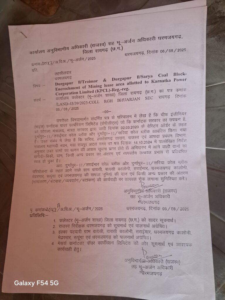 पुर्णवास विभाग के द्वारा विस्थापित बंगाली परिवार को दी गयी। आबंटन भूमि का राजस्व रिकॉर्ड की हेर फेर काट पीट करते हुए नाम चढ़वा लिया तथा परिवार के अन्य सदस्यो के नाम कुटरचना कर चढ़वा लिया तथा कई भूमि धारको द्वारा ज़मीन की खरीदी बिक्री किया। कई लोग द्वारा आबंटन भूमि का प्लांटिंग कर बेचा गया है। चुकि इन विस्थापितों के द्वारा नियम विरुद्ध क्रय करने वाले भूमि का डायवार्सन कर पेट्रोल पम्प राइस मिल तथा कई ऊँची ऊँची इमारते खड़ी करने बैंको से कर्ज लेकर निर्माण कर चुके हैं। इन विक्रेताओं के द्वारा परमिशन के नाम पर भूमि स्वामी अधिकार प्रमाण पत्र ” जिलाध्यक्ष से लेकर स्थानियों अधिकारियो से मिली भगत कर रजिस्ट्री कर नामांतरण करवा लिया है। ” छ. ग. भू राजस्व संहिता 1959 की धारा 165 (7 ख ) के अनुसार ” उपधारा (1) मे अंतविस्ट किसी बात के होते हुए कोई भी ऐसा व्यक्ति जो कोई राज्य सरकार से धारण करता है या कोई भी ऐसा व्यक्ति जो 158 की उपधारा (3) के अधीन भू स्वामी अधिकार मे भूमि धारण करता है। अथवा जिसे कोई भूमि सरकारी पट्टेदार के रूप मे दखल मे रखने का राज्य सरकार या कलेक्टर द्वारा दिया जाता है। तत्पश्चात ऐसे भूमि का भूमि स्वामी का बन जाता है। ऐसी भूमि का अंतरण कलेक्टर की अनुज्ञा जो लेख वृद्ध किये जाने कारणों ही दी जावेगी के बिना नहीं करेगा। ” कलेक्टर रायगढ़ द्वारा भू राजस्व संहिता 1959 की धारा 165 (7 ख) के अनुसार क्षेत्रों मे कई पट्टा को निरस्त कर चूका है। कलेक्टर रायगढ़ को पुर्णवास भूमि मे हेर फेर कर चढ़वाने व भूमिहीन बनकर पट्टा पा लेने की शिकायत तो हुयी है। जिसकी जांच न्यायलय तहसीलदार द्वारा किया जा रहा है। तथा ” आबांटन भूमि जिस प्रकार भूमि स्वामी अधिकार प्रमाण पत्र पाकर क्रय विक्रय किया गया और कई भूमि का प्लांटिंग किया गया वैद्य परिजन के अलावा अन्य लोगो का नाम दर्ज करवाया गया।एवं विस्थापित परिवारों की दी गयी। अबानटिट भूमि का जांच कर अवैधनिक रूप से पट्टा को जांच कर निरस्त करते हुए नियमों के उलंघन करने वालो पर कानूनन कार्यवाही करना चाहिए क्षेत्र मे कई कोल परियोजना चालू होने वाला है। वास्तविक किसान को मुआवजा मिलना चाहिए और अवैध पर कार्यवाही।