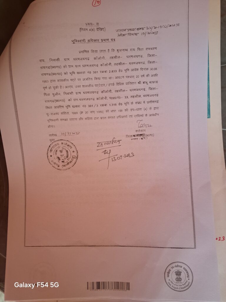 धर्मजयगढ़ -: राज्य शासन द्वारा प्रदेश मे निवासरत आदिवाशियों व अन्य सामुदाय के लोगो को जीवन स्तर बेहतर बनाने व मौलिक सुविधाऐ देने के लिए समय- समय पर जनहित की योजनाय चलाती हैँ जिसमे प्रमुख योजनाएं मे भूमिहिनो को कस्तकारी करने भूमि स्वामी हक़ पट्टा वितरण किया गया पूर्व वर्ती सरकार हो या वर्त्तमान सरकार इस योजनाओं को आजादी के बाद से भूर्त रूप देते हुए नियमों के तहत भूमि आबंटन किया है। कुछ माफियाओ के द्वारा नियमों को दरकिनार कर अवैधनिक रूप से इन ज़मीनो का हेरा फेरी किया जा रहा है। शासन के जनहितवी योजना मे 1979 -80 मे भूमिहिनो के भूमि आबंटन किया था वही बंगाली विस्थापितों को आर. आर. नंबर (रजिस्ट्रेशन परिवार ) के आधार पर पुर्णवास आबंटन पट्टा 2016 मे दिया गया था। तथा पूर्व वर्ती सरकार द्वारा वनभूमि मे काबिज आदिवासियों को 20 वर्षो तक कब्ज़ा की कस्तकारी करने पिछड़ा व सामान्य वर्ग के लोगो को 75 वर्ष की काबिज भूमि पर कस्तकारी करने व न्यायलय तहसील मे काबिज भूमि का बेदखली चालान जमा करने पर वन समिति नगर पंचायतो की प्रस्ताव के अनुसार भूमि स्वामी हक़ प्रदान किया गया था। जो छ. ग. भू राजस्व संहिता 1959 की धारा 165 (7 ख) के तहत इस अबान्तिट भूमि का कलेक्टर परमिशन के अलावा वासियातनामा दाननामा बिक्रीनामा तथा बरिशान के छोड़ अन्य बिक्री नहीं जोड़ सकता। अनुविभाग धर्मजयगढ़ मे वन अ बंटित भूमि का भू राजस्व संहिता 1959 (7 ख ) का अवेहेलना करते हुए कई भूमि का क्रय विक्रय व नामांतरण हो चूका है।जिसमे