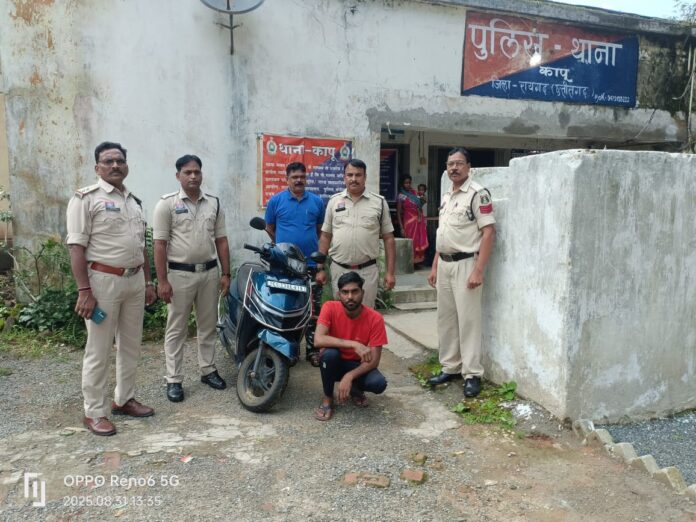 रायगढ़, 31 अगस्त। कापू पुलिस ने आज बड़ी कार्रवाई करते हुए कदमचौक से एक स्थायी वारंटी आरोपी को चोरी की स्कूटी बेचने की फिराक में दबोच लिया। थाना प्रभारी कापू उप निरीक्षक इगेश्वर यादव को मुखबिर से सूचना मिली थी कि एक व्यक्ति चोरी की जुपिटर स्कूटी बेचने ग्राहक तलाश रहा है। सूचना पर तत्काल कार्रवाई करते पुलिस ने मौके से संदेही को पकड़ा जिसके पास से स्कूटी क्रमांक सीजी 13 बीई 9161 बरामद की गई। पूछताछ में आरोपी ने खुलासा किया कि उसने 27 अगस्त की रात वन विभाग परिसर, शराब भट्टी के सामने मेन रोड से स्कूटी चोरी की थी। इस संबंध में थाना कापू में अपराध क्रमांक 144/2025 धारा 303(2) बीएनएस पंजीबद्ध है।