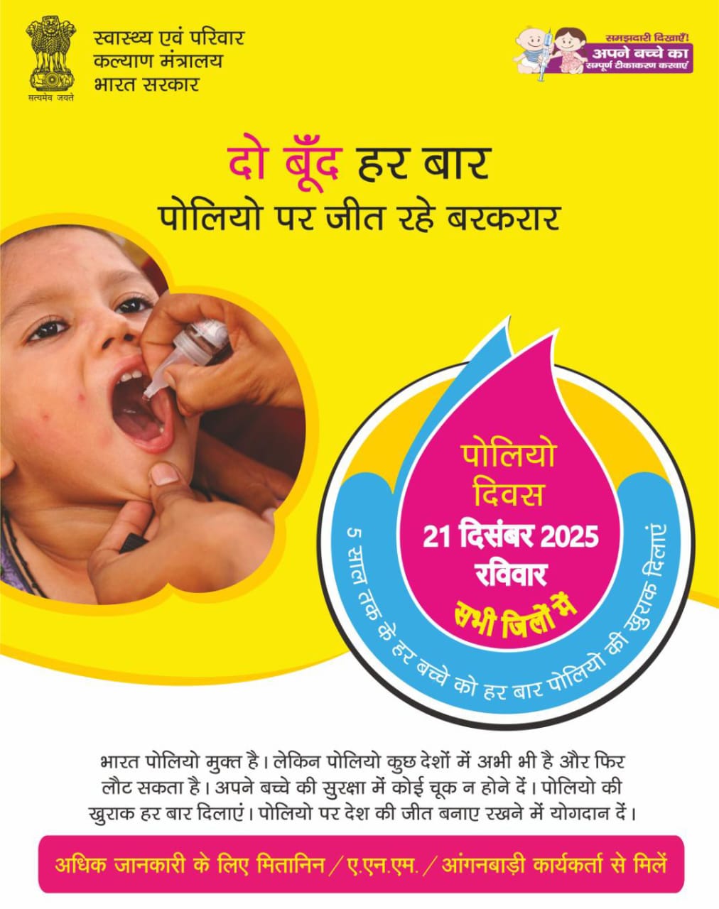कलेक्टर श्री मयंक चतुर्वेदी एवं मुख्य चिकित्सा एवं स्वास्थ्य अधिकारी डॉ. अनिल कुमार जगत ने जिले के सभी अभिभावकों से अपील की है कि वे अपने 5 वर्ष तक के सभी बच्चों को 21 दिसम्बर रविवार को नजदीकी पल्स पोलियो बूथ पर लाकर पोलियो वैक्सीन की दो बूंद अवश्य पिलाएं और जिले को पोलियो मुक्त बनाए रखने में अपना सहयोग दें।